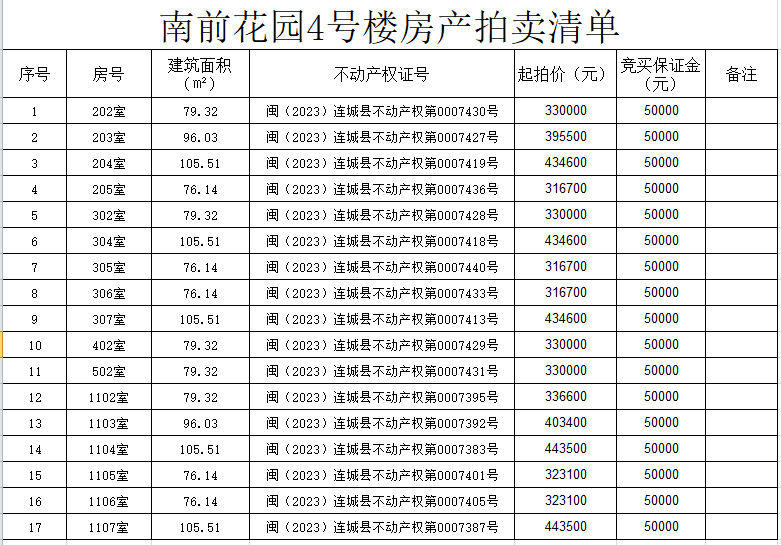2026年4月17日公开拍卖连城县南前花园17套房产