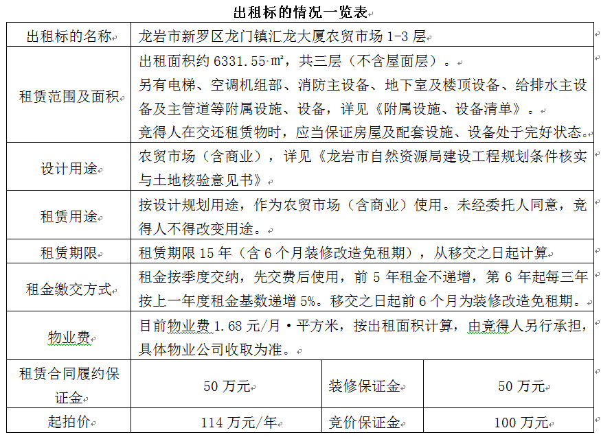 1、福建省龙岩市新罗区罗龙西路(龙门镇)汇龙大厦农贸市场1-3层15年租赁权;