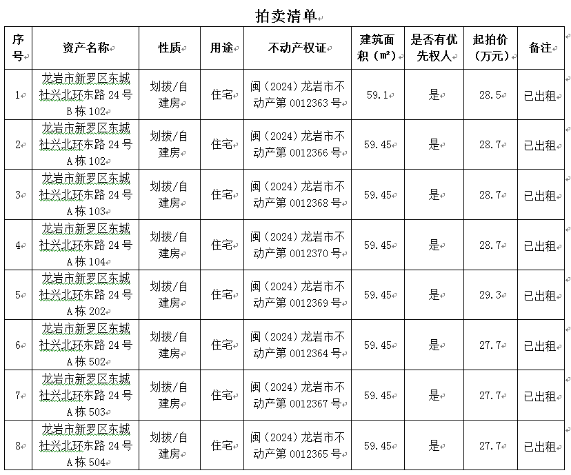 2、福建省龙岩市新罗区东城社兴北环东路24号A幢7套、B幢1套共8套住宅(分开拍卖);