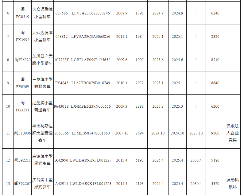 3、丰田凯美瑞、本田雅阁、本田CR-V、日产天籁、大众迈腾、丰田柯斯达客车、庆铃货车等机动车13部