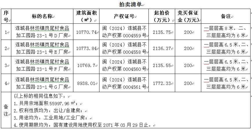 连城县林坊镇岗尾村食品加工园路23-1号(甘薯产业园)D幢、E幢、F幢及G幢等4幢厂房(分开拍卖,详见《拍卖清单》)