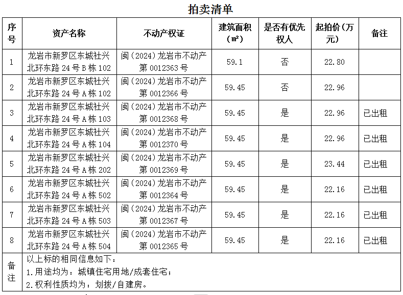 1、龙岩市新罗区东城社兴北环东路24号8套房产(分开拍卖,详见《拍卖清单》);