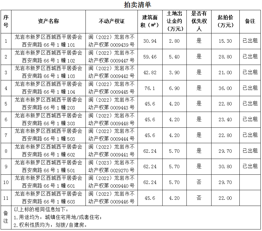 2、龙岩市新罗区西城西平居委会西安南路66号11套房产(分开拍卖,详见《拍卖清单》);