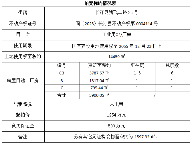2024年11月28日公开拍卖龙岩市长汀县腾飞二路25号(原康佳味)一宗工业用地使用权及厂房和构筑物
