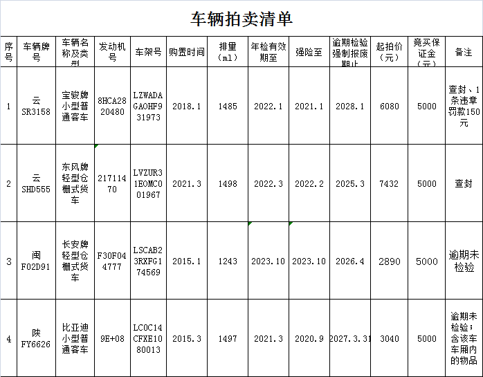 3、公安机关依法处置的宝骏客车、比亚迪客车、东风货车、长安货车等机动车4部。