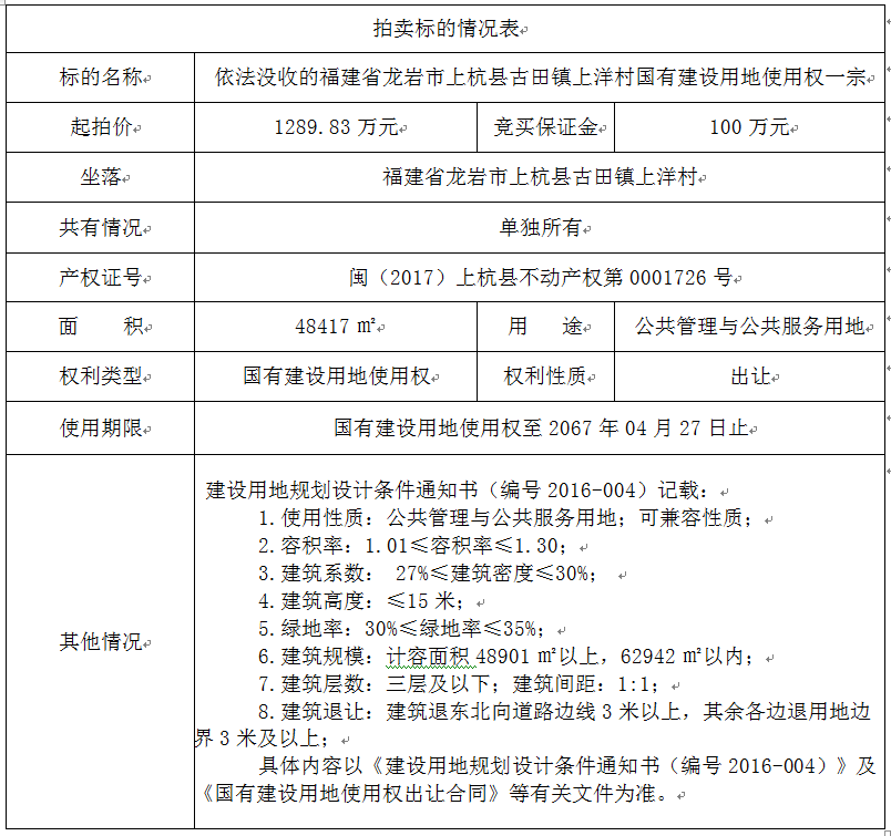 受委托,我司定于2025年4月29日10时至2025年4月30日10时止(延时的除外)在淘宝网资产竞价网络平台(https://zc-paimai.taobao.com)公开拍卖依法没收的福建省龙岩市上杭县古田镇上洋村国有建设用地使用权一宗(详见标的情况),起拍价:1289.83万元,竞买保证金:100万元