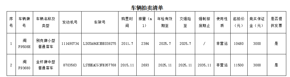 2025年5月9日公开拍卖别克GL8、金杯客车、旧编织袋一批(2025年度,约30万条)、废旧办公桌椅、空调等物资一批以及闲置汽修配件一批