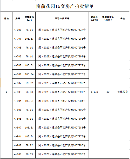 2025年6月18日公开拍卖连城县莲峰镇南前花园4号楼15套房产(整体拍卖)