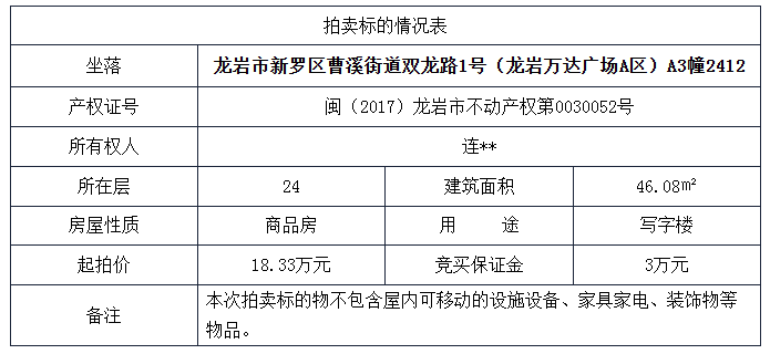 1、公安机关依法没收的龙岩市新罗区曹溪街道双龙路1号(龙岩万达广场A区)A3幢2412房产;