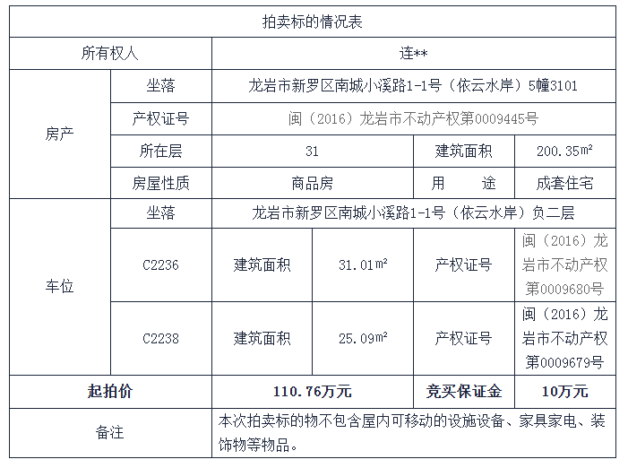 2025年11月6日公开拍卖公安机关依法没收的龙岩市新罗区依云水岸5幢3101房产及负二层C2236、C2238号车位,龙岩万达广场A区A3幢2412房产