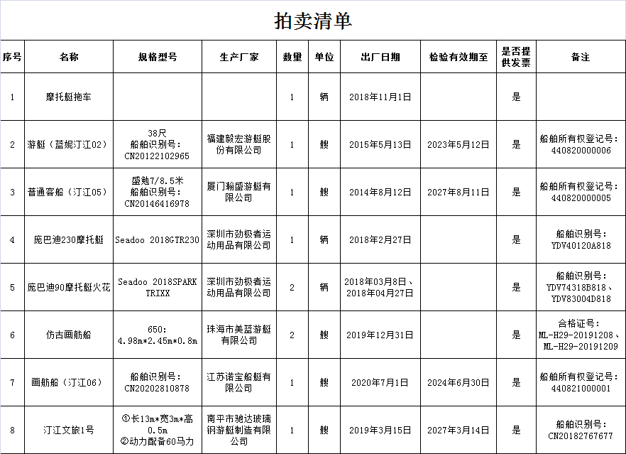 2026年2月9日公开拍卖游艇、画舫船、快艇、摩托艇(含1台拖车)等船舶一批