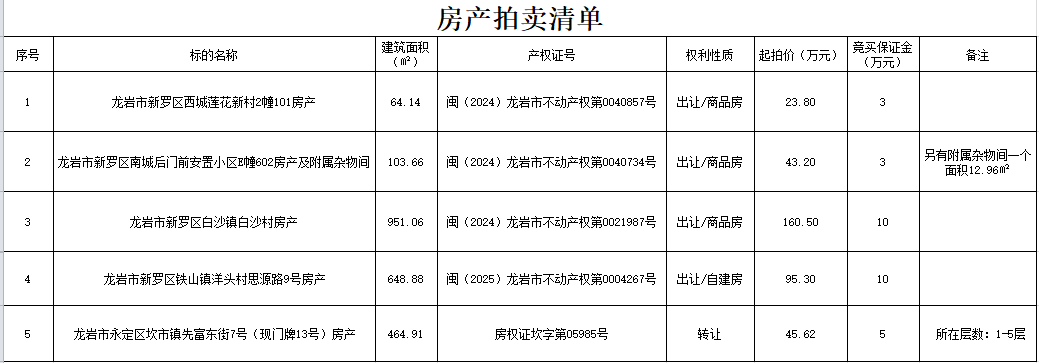 2026年3月5日公开拍卖新罗区、永定区及武平县房产